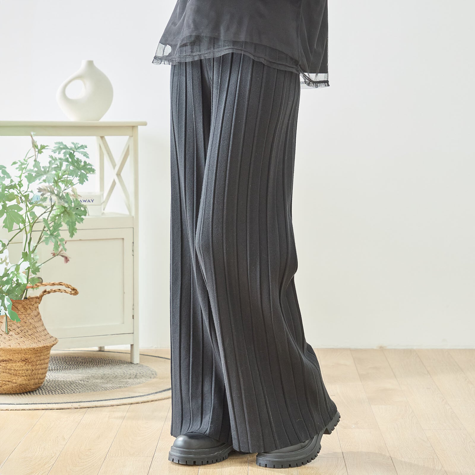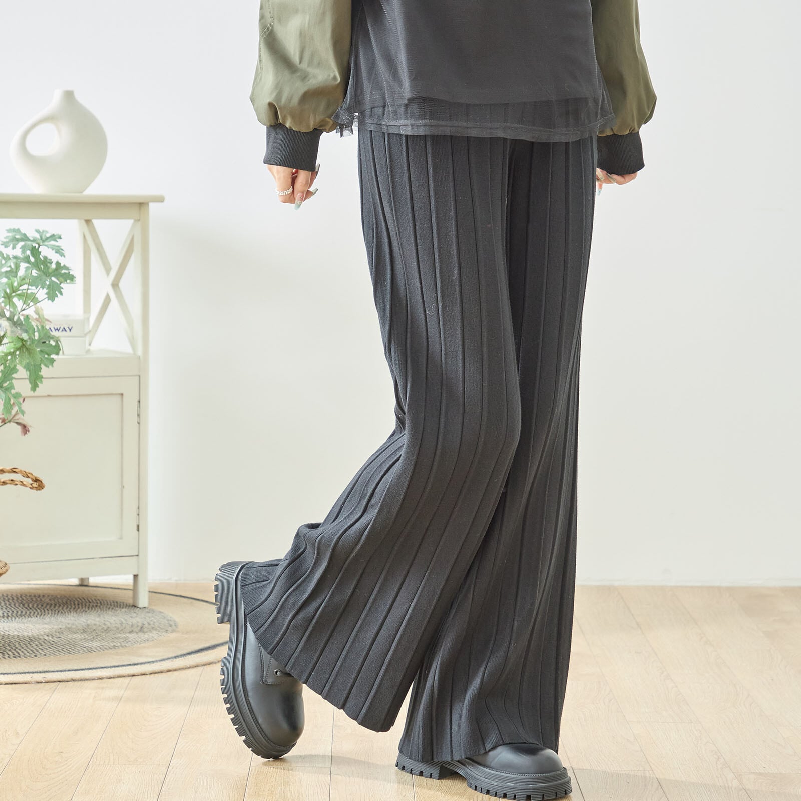 [Design]立体感のあるリブ編みが美脚効果を引き出す、上品リラックスパンツ。縦ラインを強調することで脚をすっきりと見せつつ、ゆったりとしたワイドシルエットで快適な穿き心地に。柔らかく伸縮性のあるニット素材は、動きやすさと暖かさを兼ね備えています。ウエストは総ゴム&リボン仕様で調整も簡単。リラックス感がありながらも、きれいめな印象を保てる大人のデイリーボトムです。