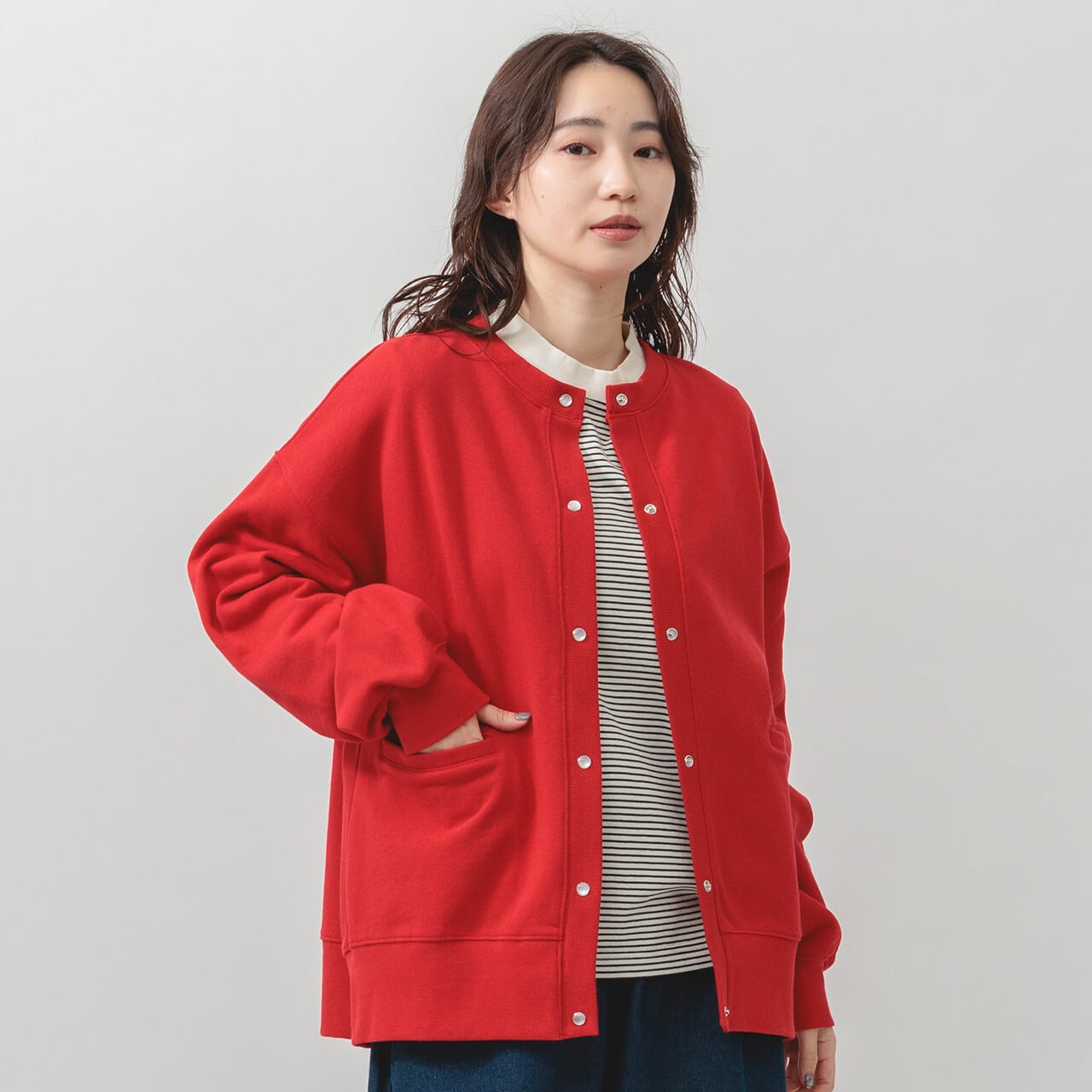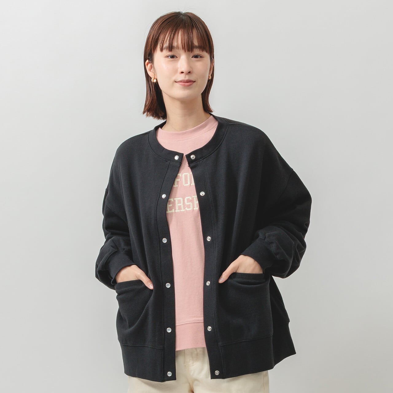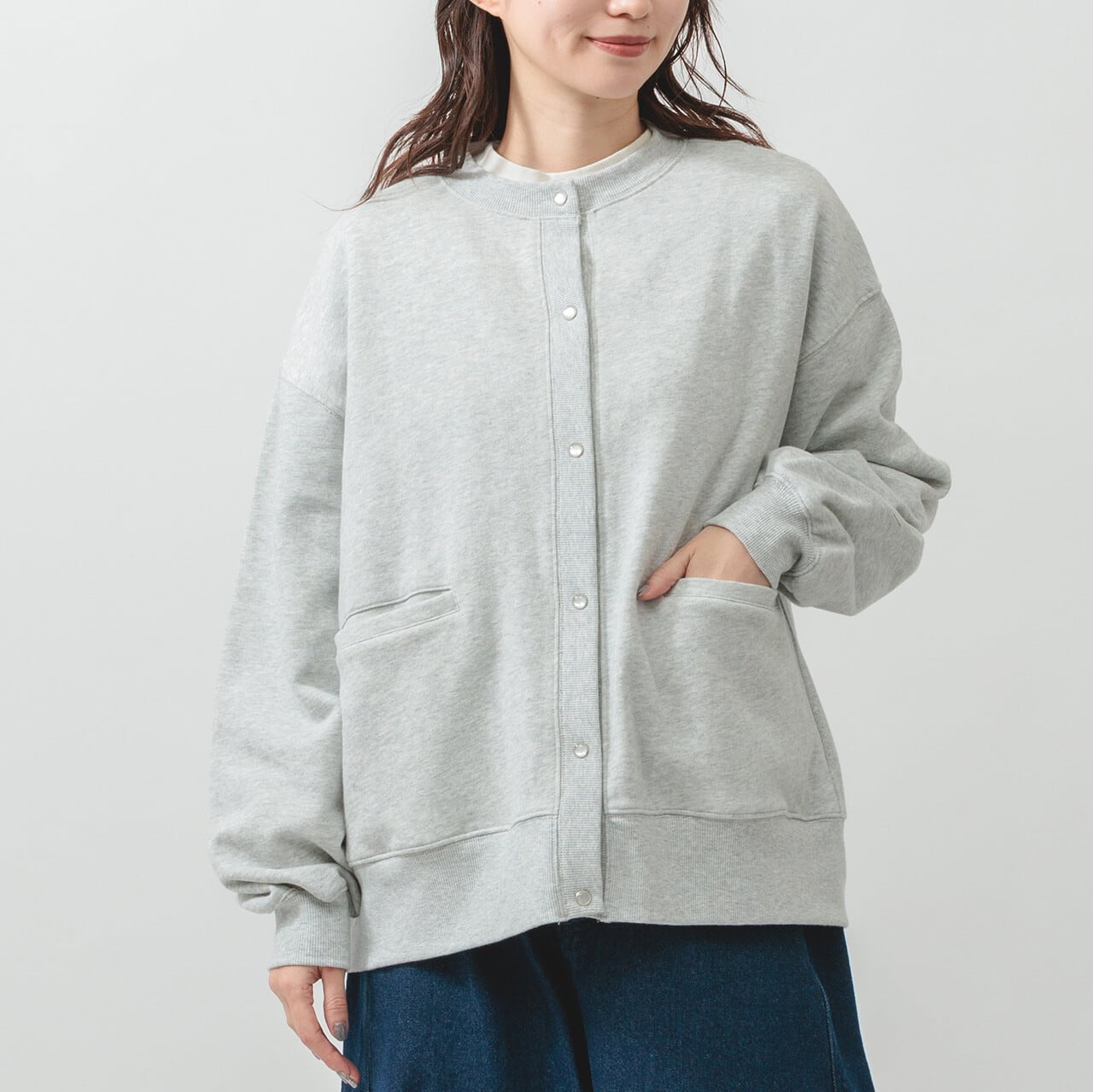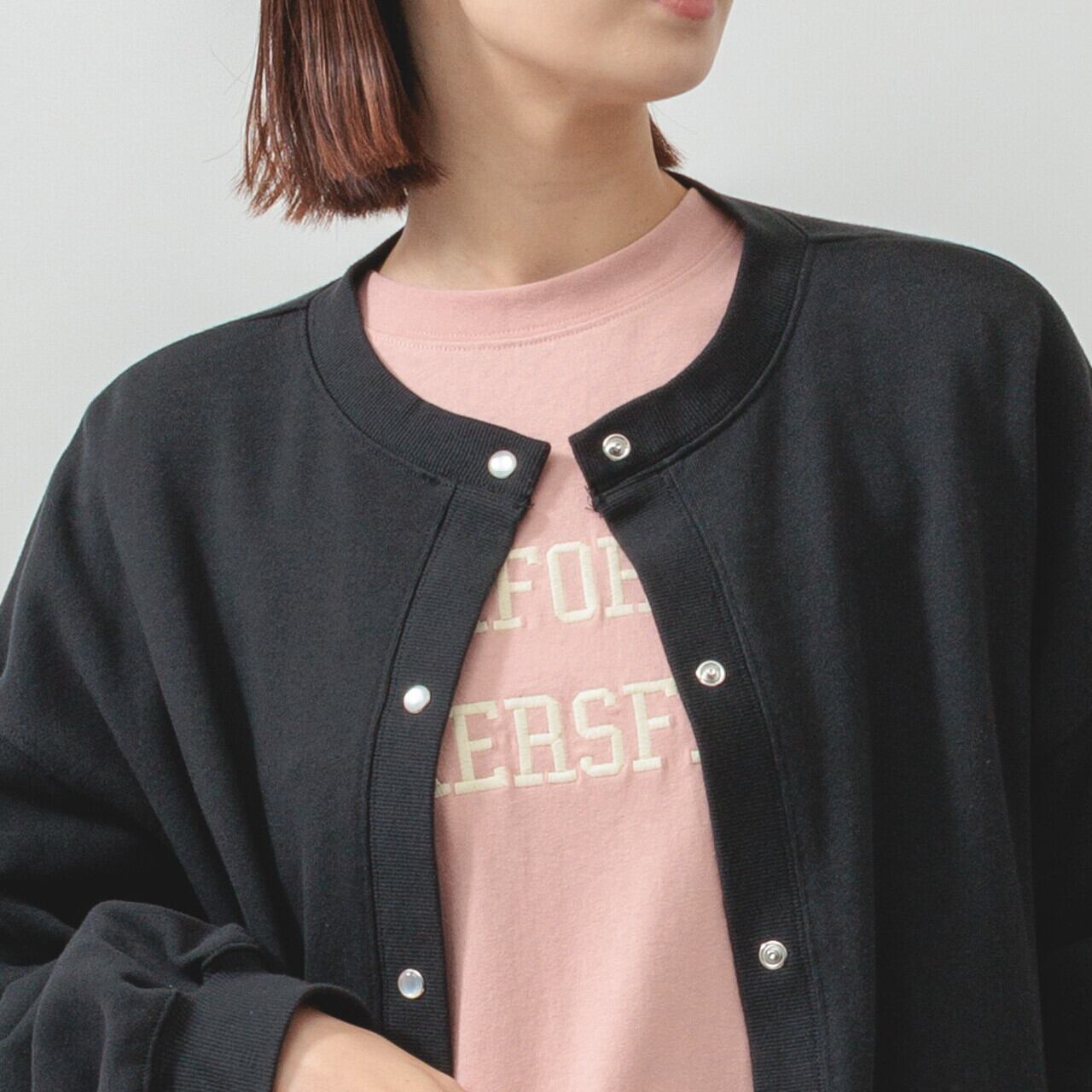 ・長袖・クルーネック・パールドット釦・ポケット有・ 衿・前立て・袖口・裾・脇部分リブ使用