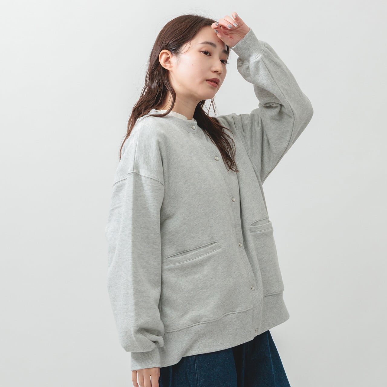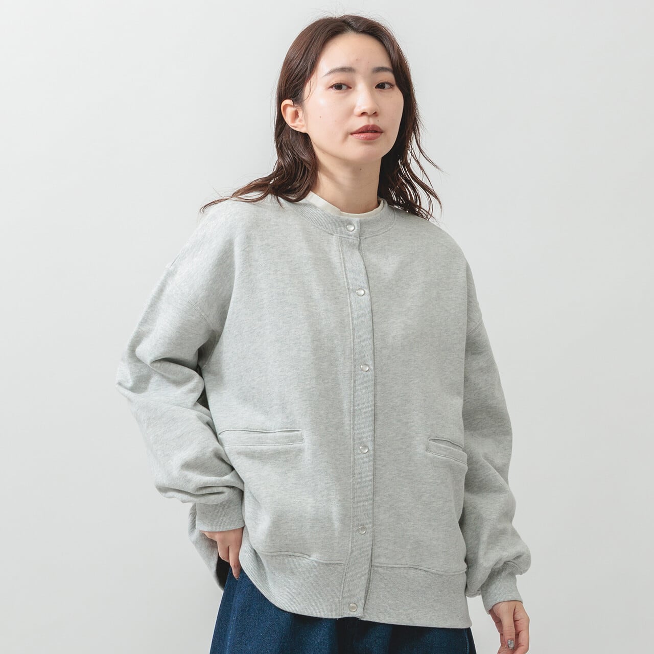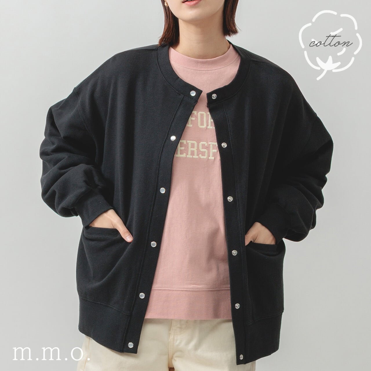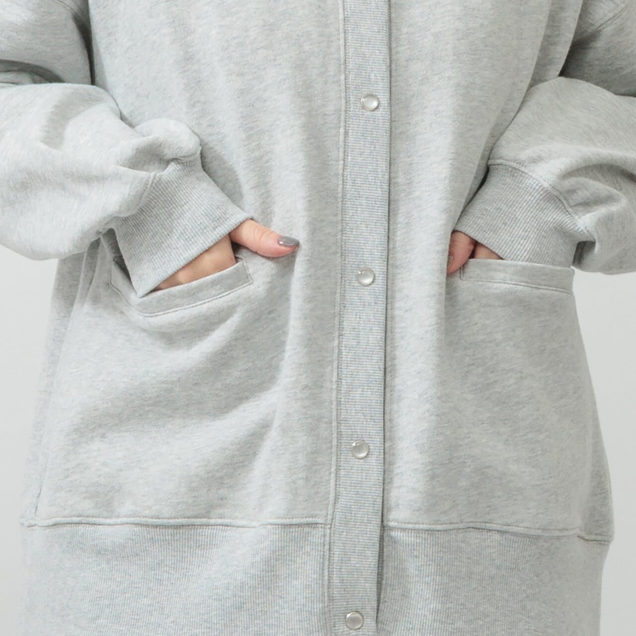 ・長袖・クルーネック・パールドット釦・ポケット有・ 衿・前立て・袖口・裾・脇部分リブ使用