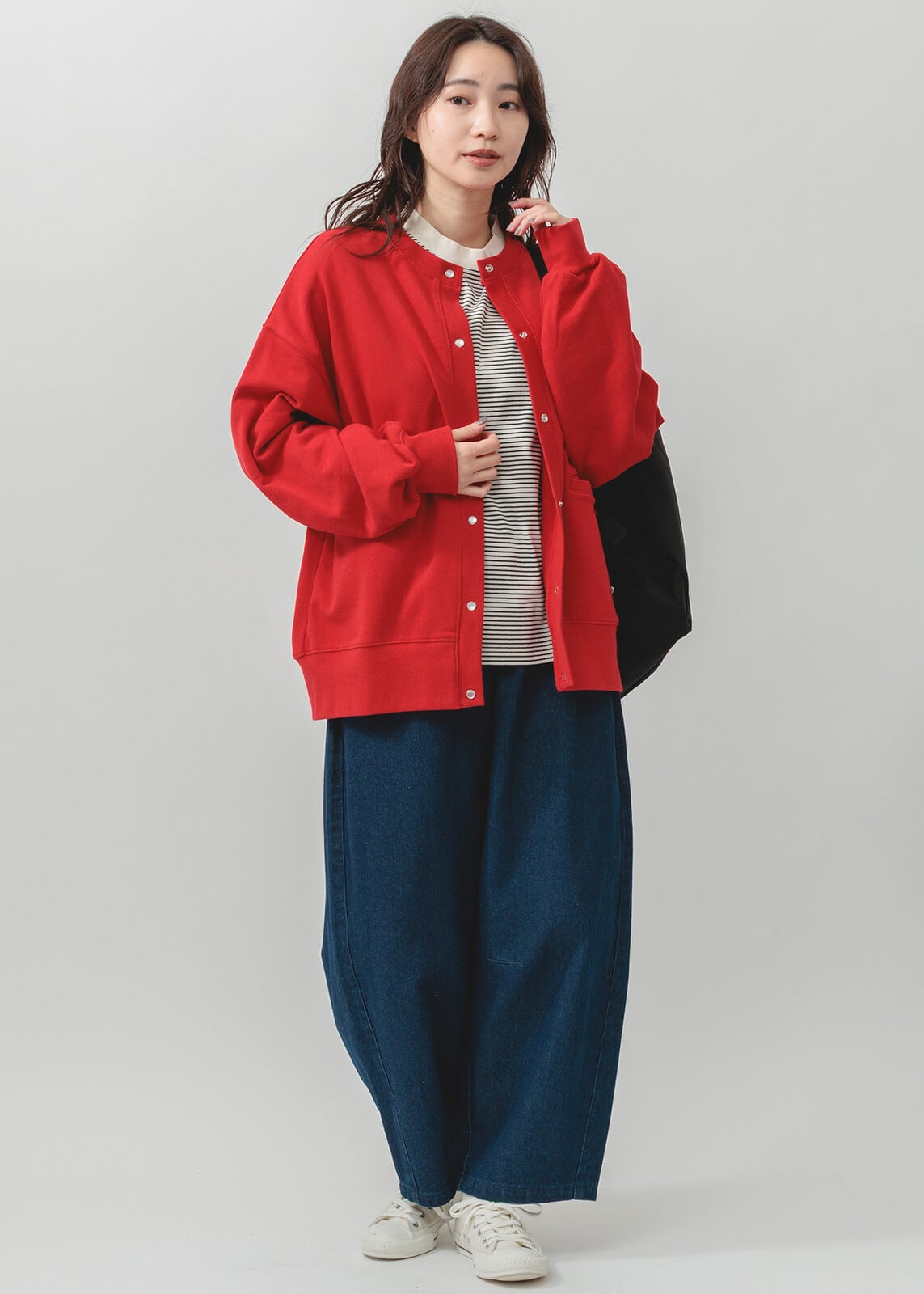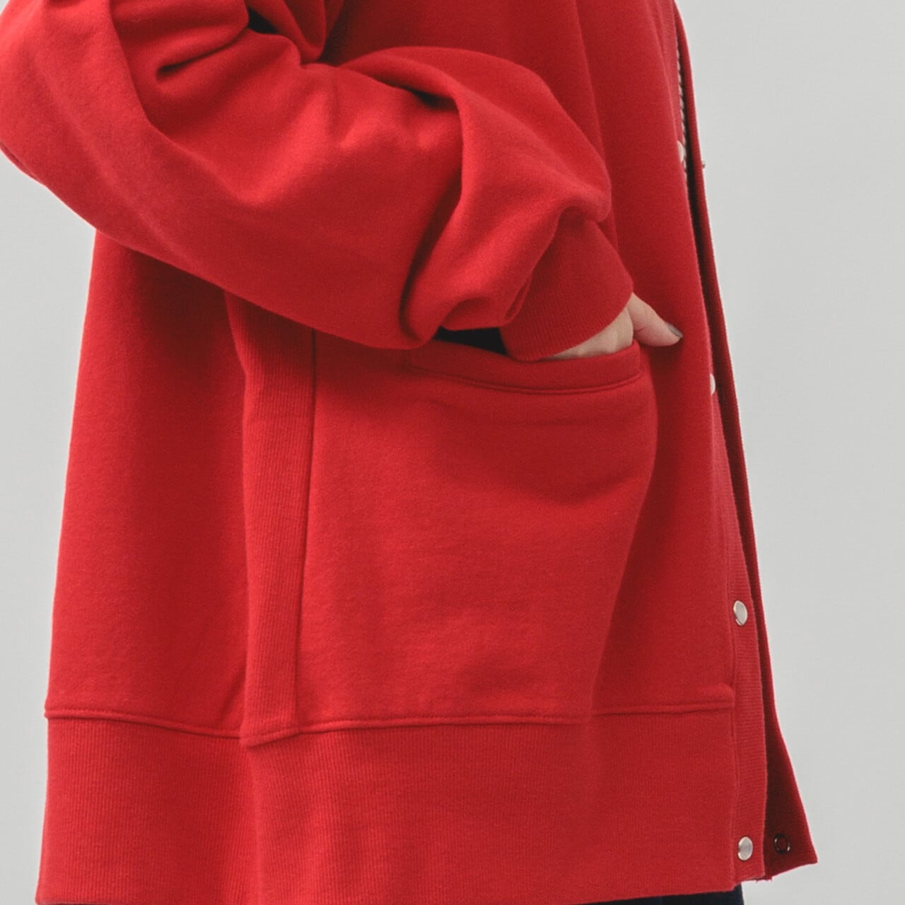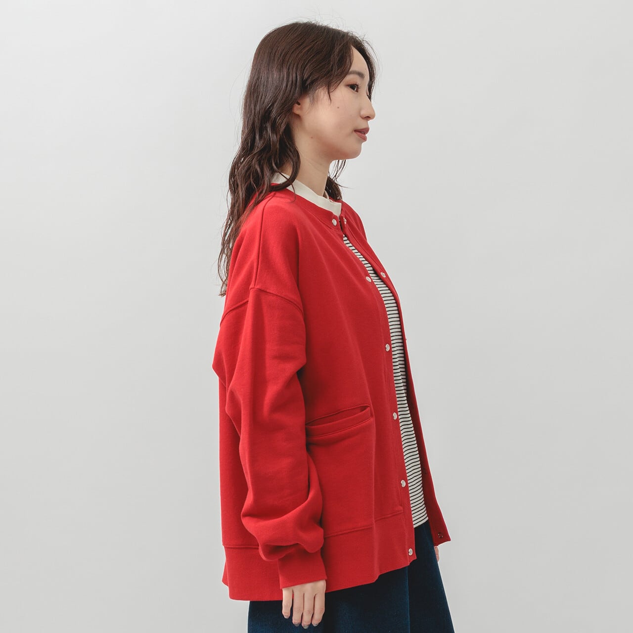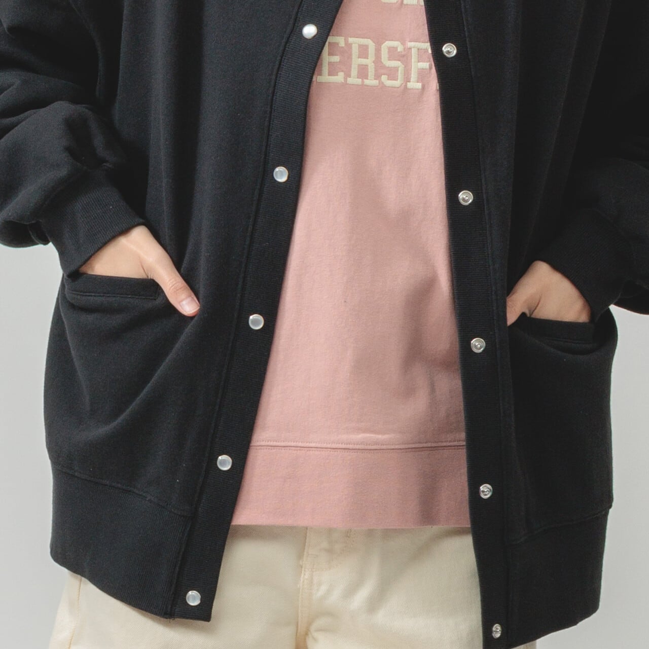 ・長袖・クルーネック・パールドット釦・ポケット有・ 衿・前立て・袖口・裾・脇部分リブ使用