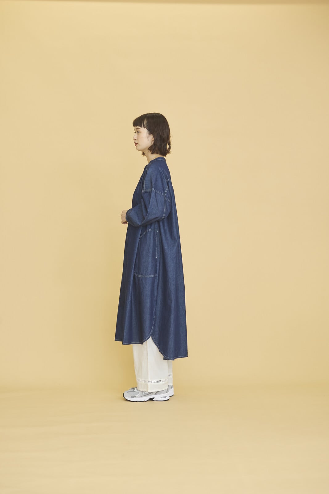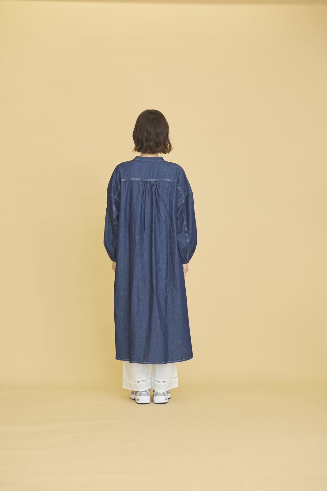 ナチュラルなデニム素材のワークシャツワンピース。程よくゆとりをもたせたシルエットで、気になる腰回りもカバーしてくれます。パンツやスカートをレイヤードしたコーディネートの他、羽織りとしての着用もおすすめ。