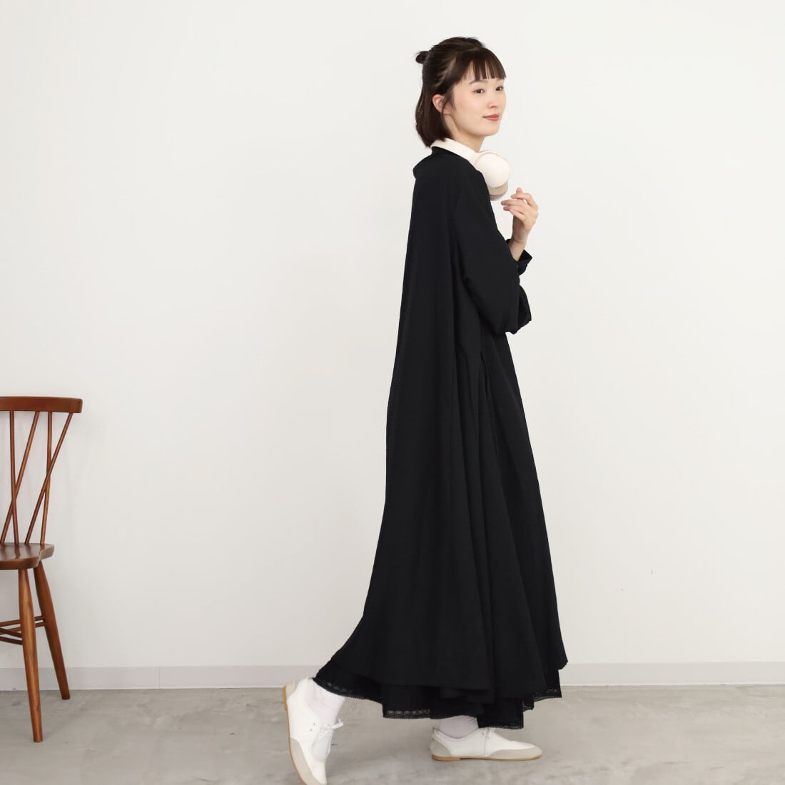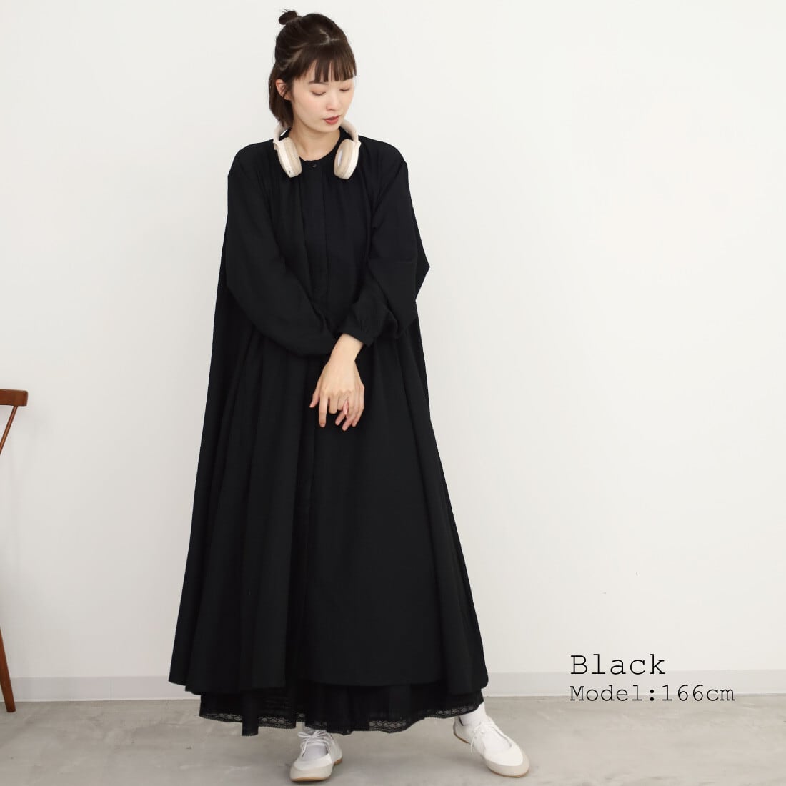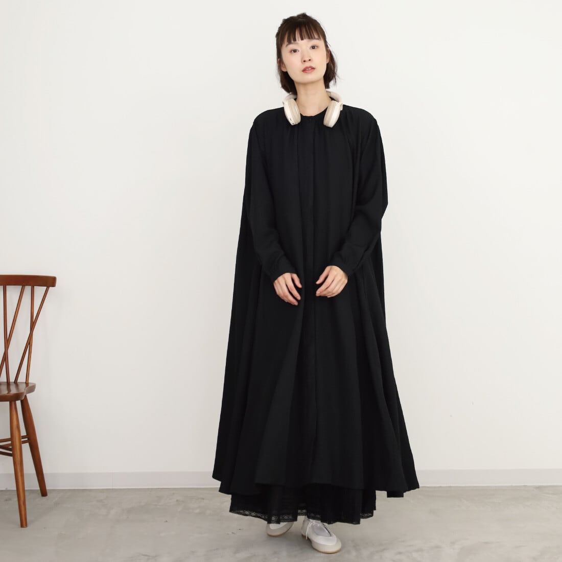裾に向かって、フレアデザインに広がる、マキシ丈のAラインワンピース。ロング丈で、1枚での着用はもちろん、スキニーデニムやリブパンツなどとのレイヤードもおすすめです。襟前ボタンをあけて、前開きでさらっと羽織っていただけば、羽織りものとしても活躍します。