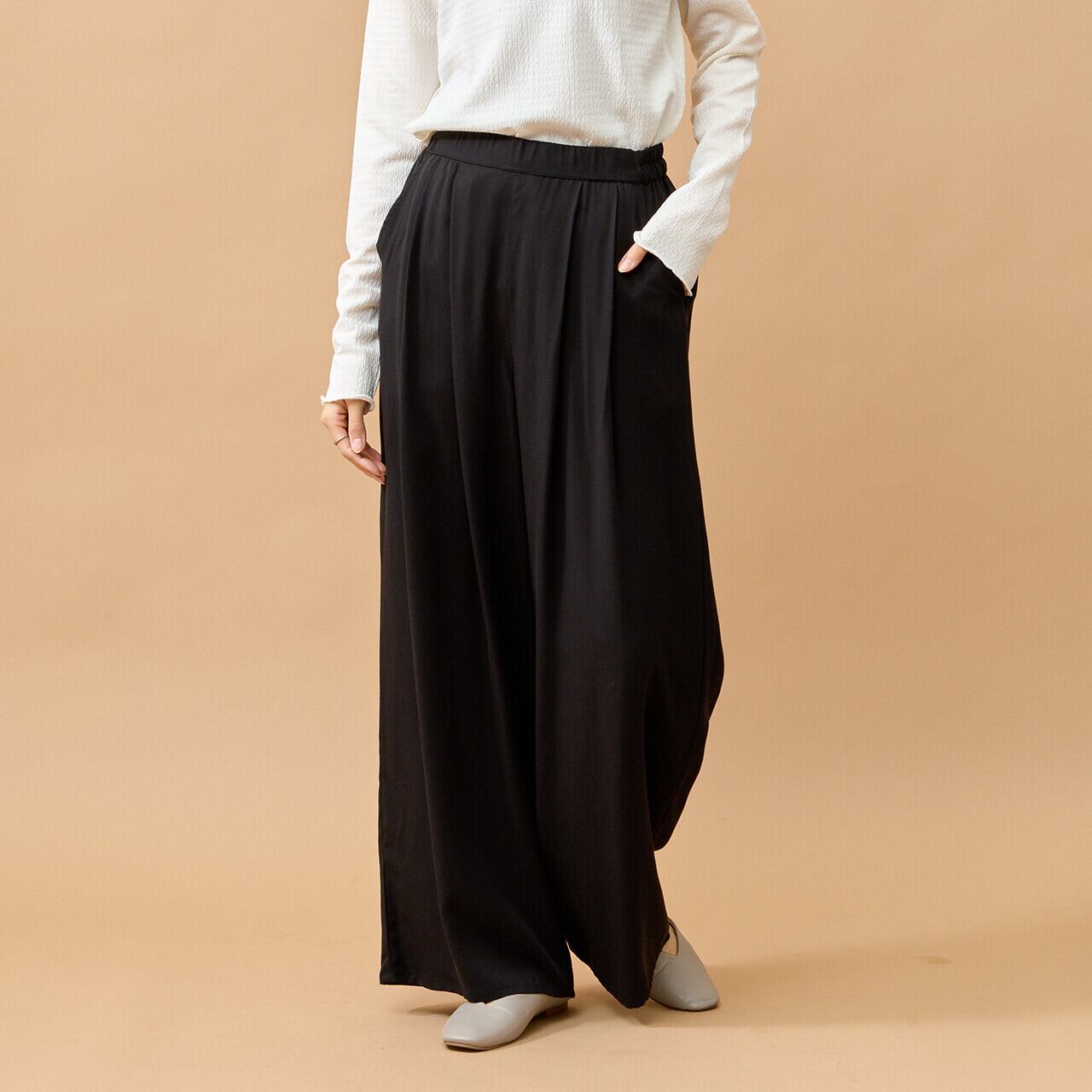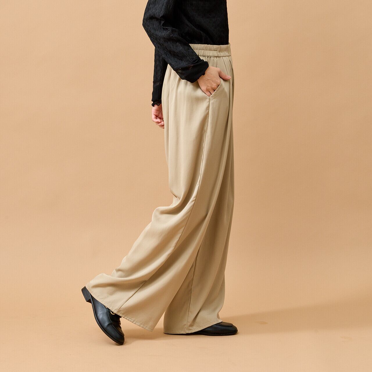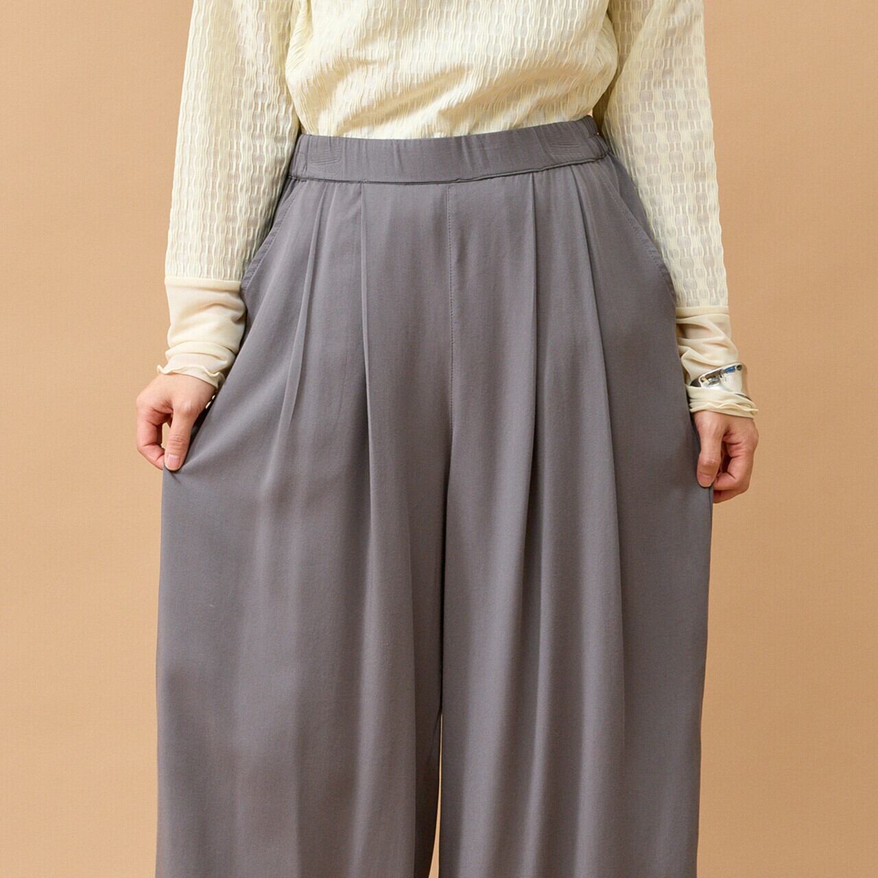 ・レーヨンテンセルの上品な落ち感 ・後ろゴム仕様で楽な着心地 ・タック入りで脚長見えシルエット