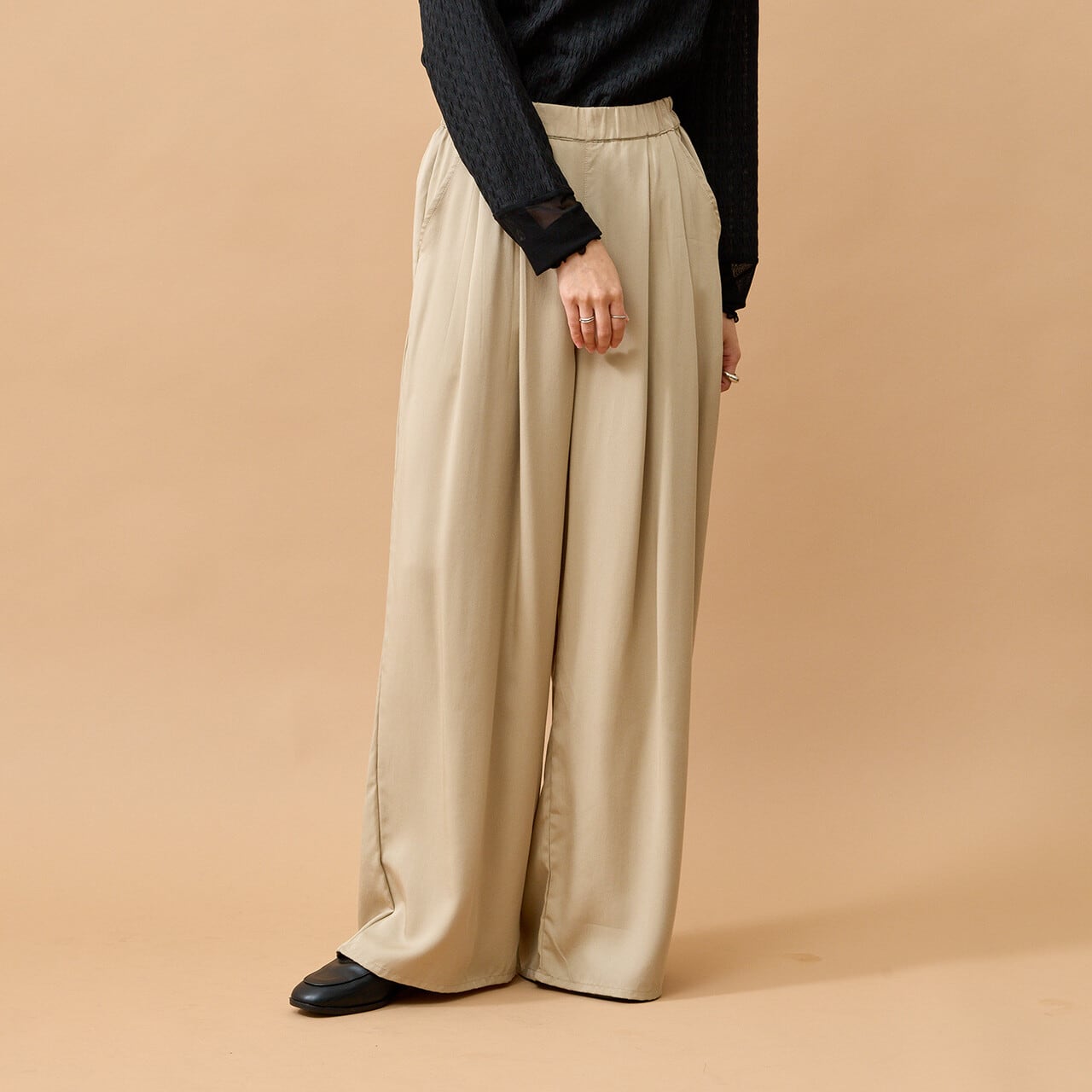 しなやかな落ち感と上品な艶のあるレーヨンテンセル素材を使用したワイドパンツ。軽やかな着心地ながらきれいめにも合わせやすく、単品でもセットアップでも活躍します。