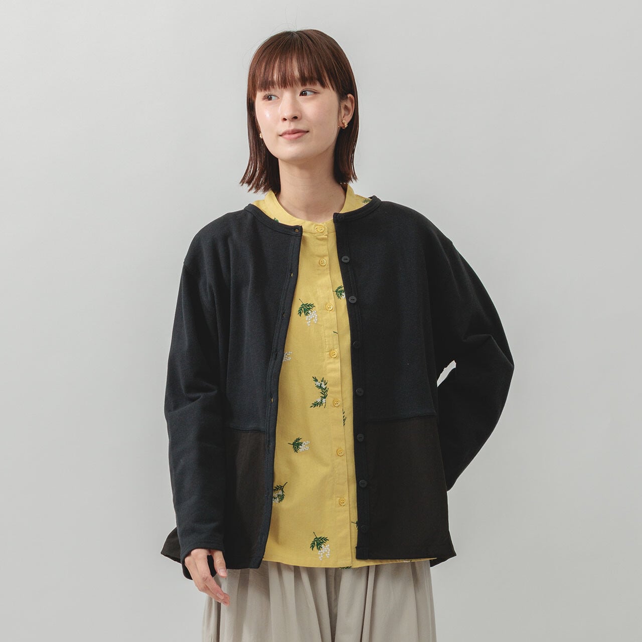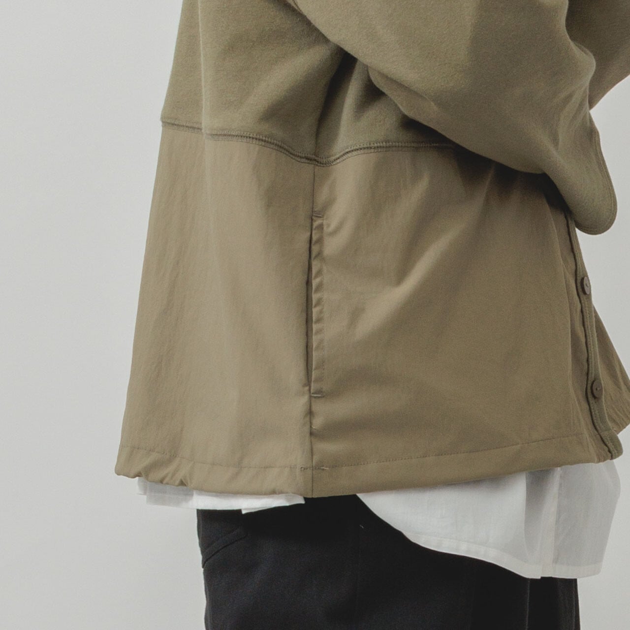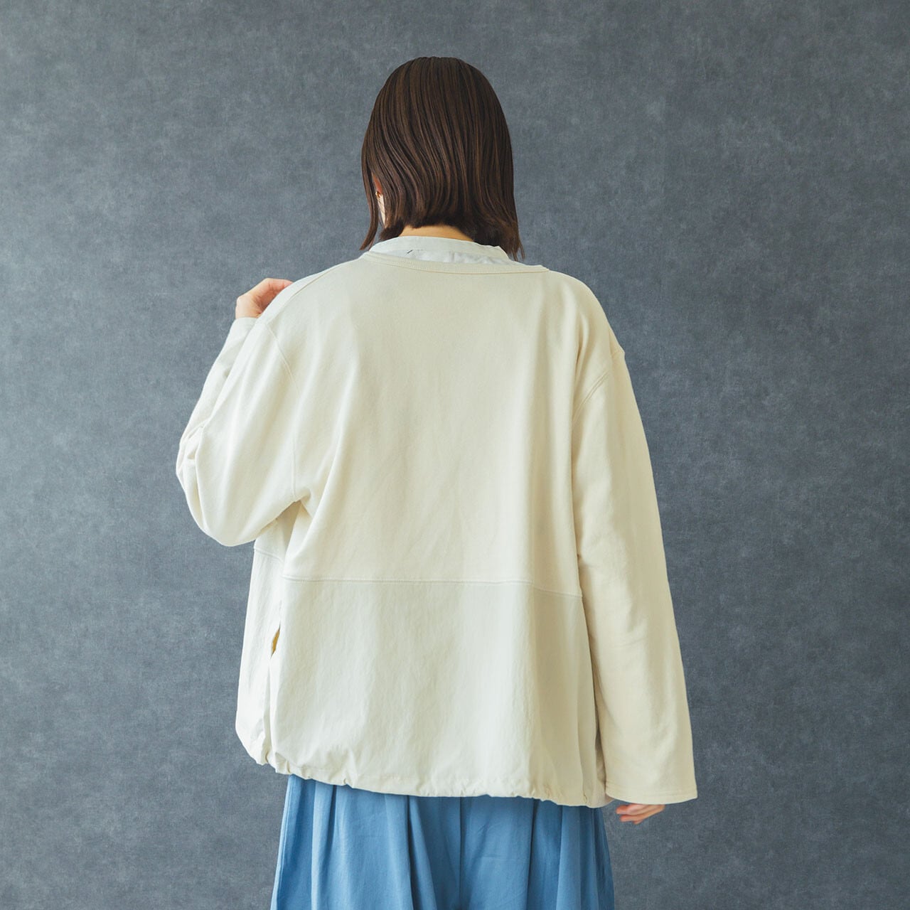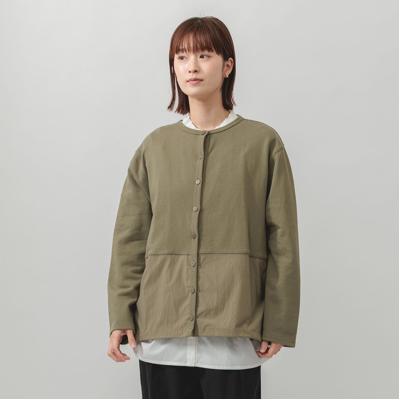 異素材切替がアクセントになった裏毛カーディガン。裾にはドロストが付いており、シルエットの変化を