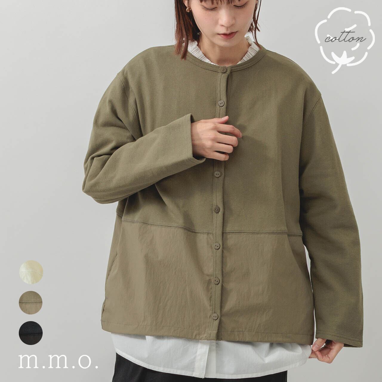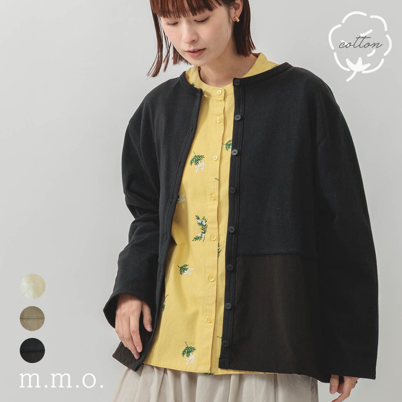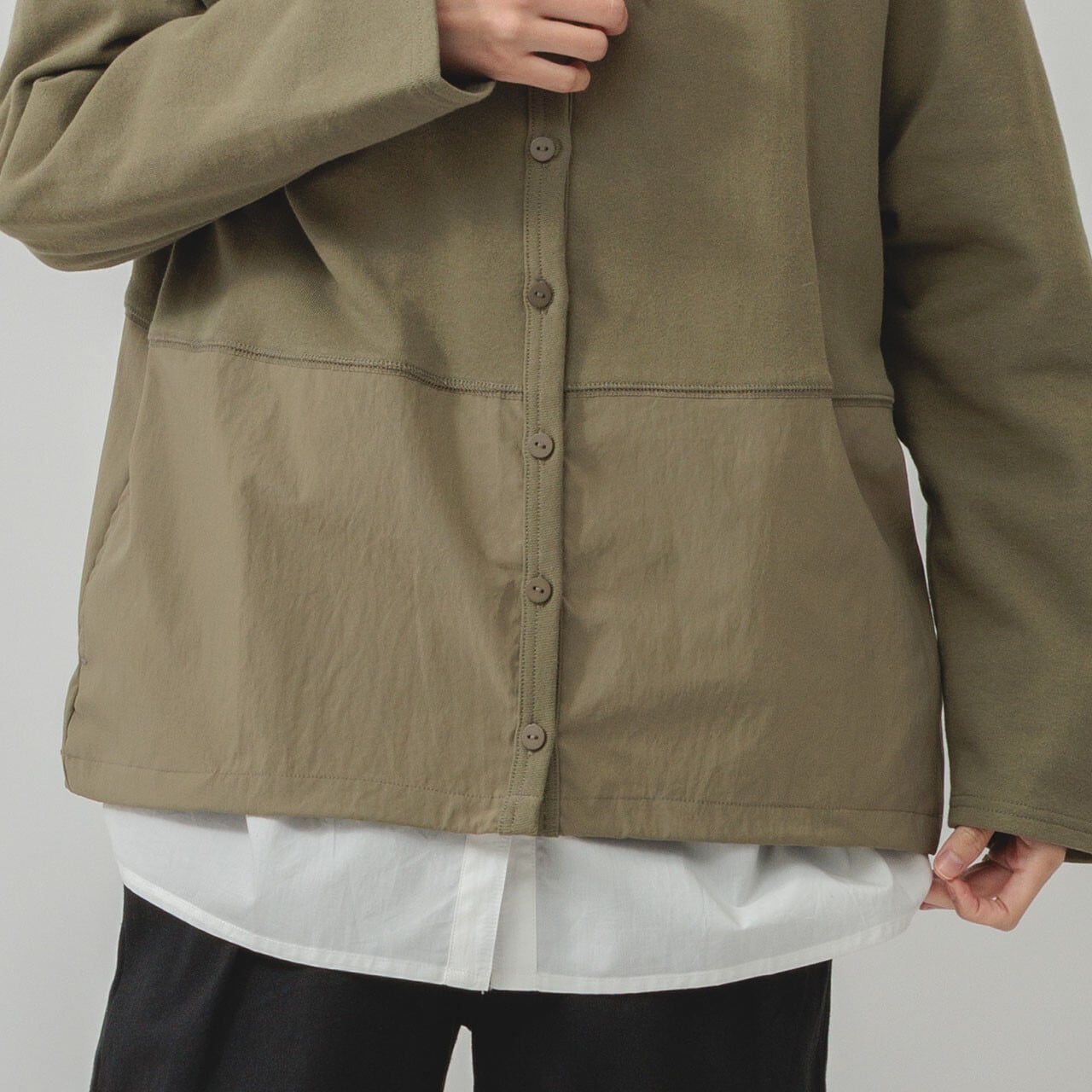 異素材切替がアクセントになった裏毛カーディガン。裾にはドロストが付いており、シルエットの変化を