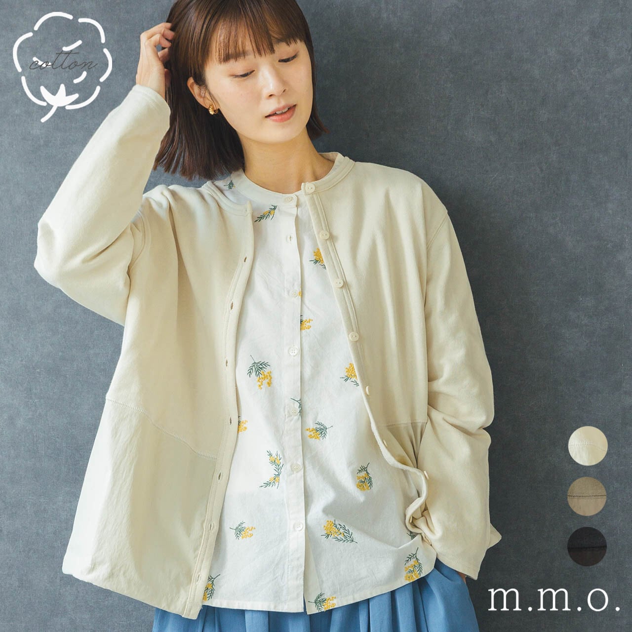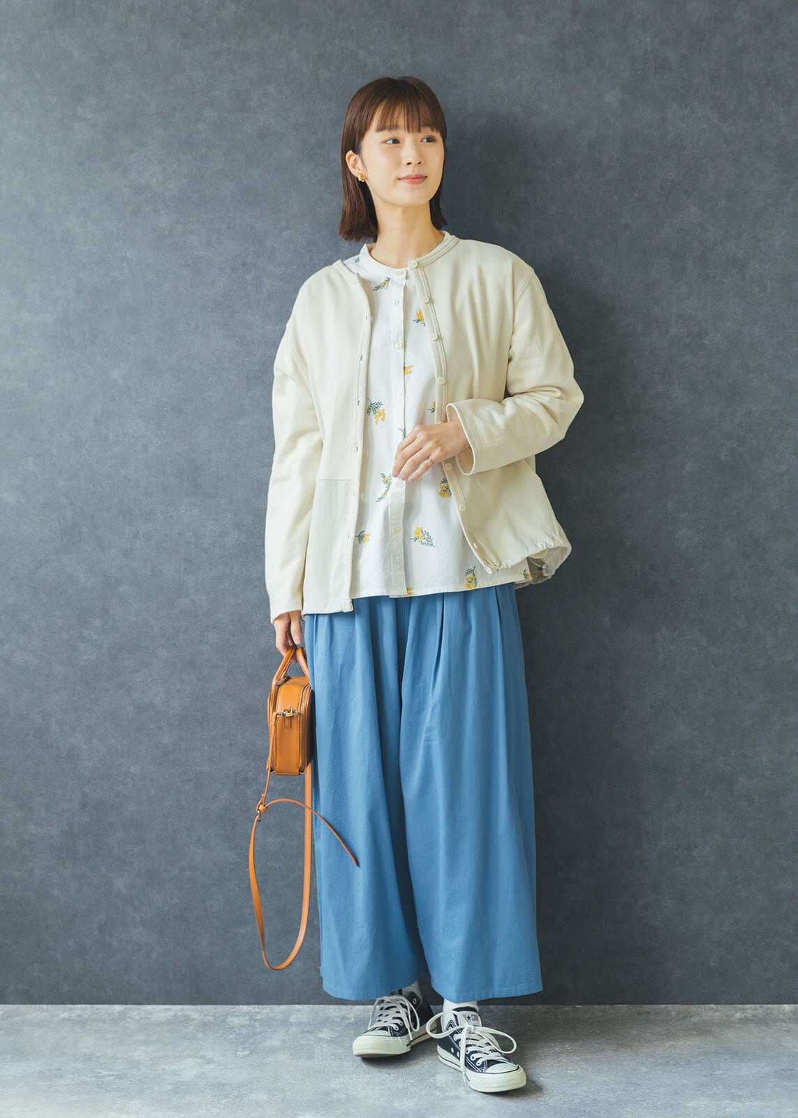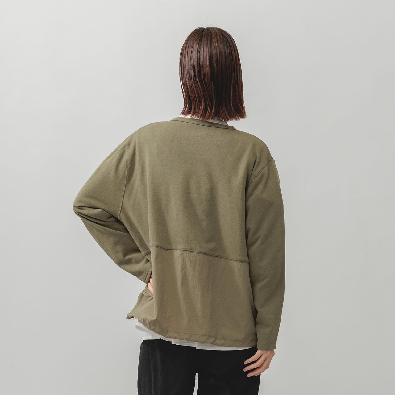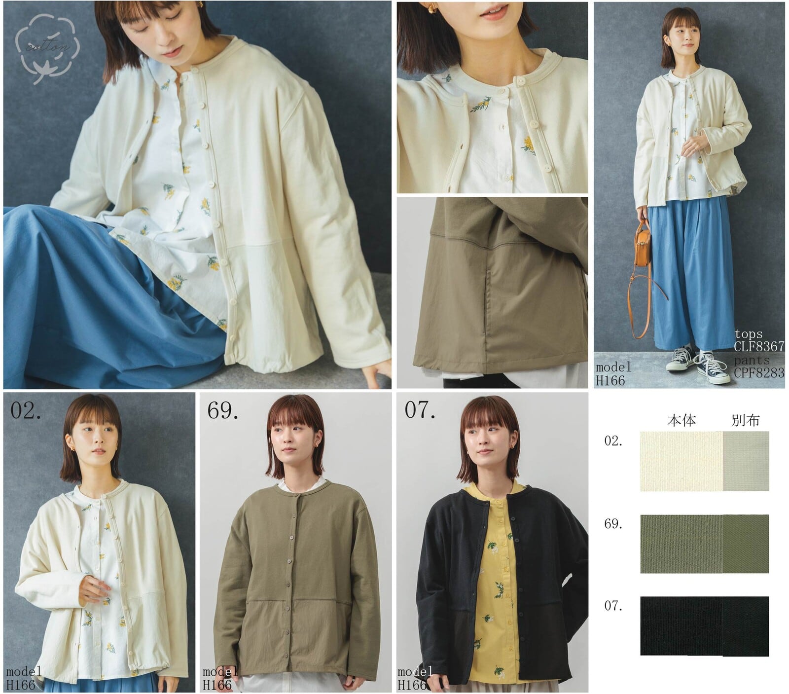 異素材切替がアクセントになった裏毛カーディガン。裾にはドロストが付いており、シルエットの変化を