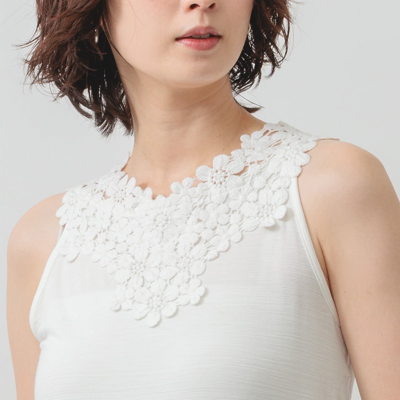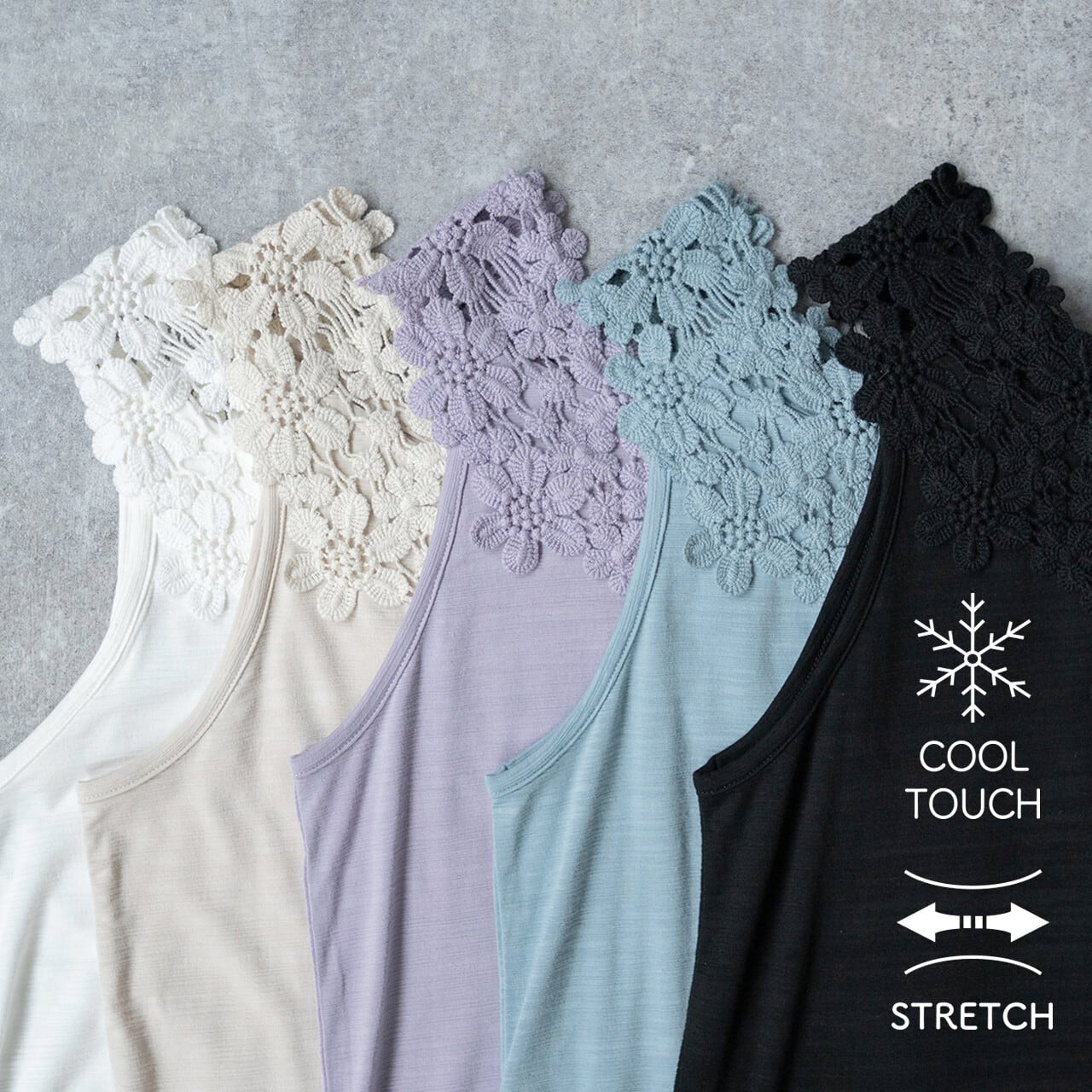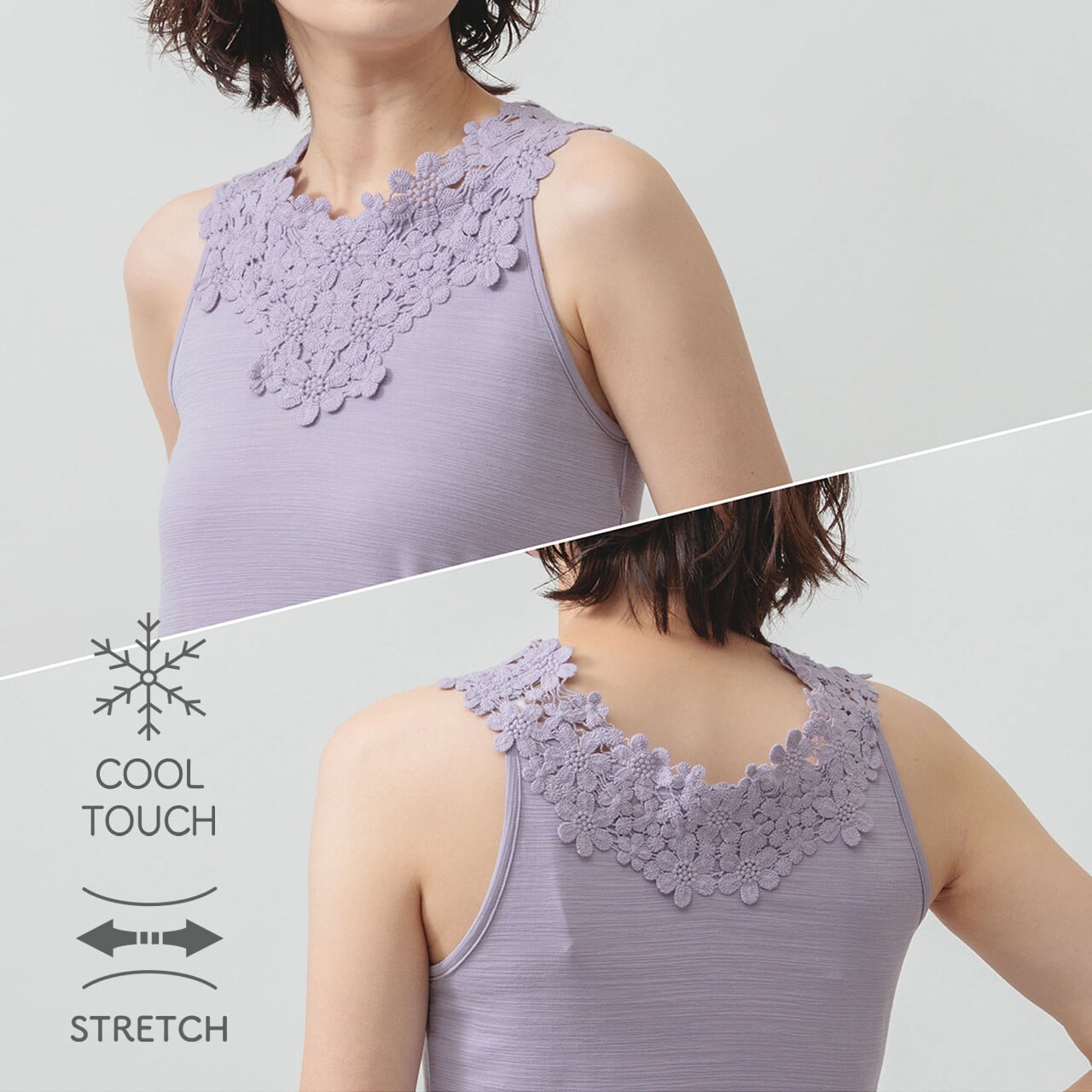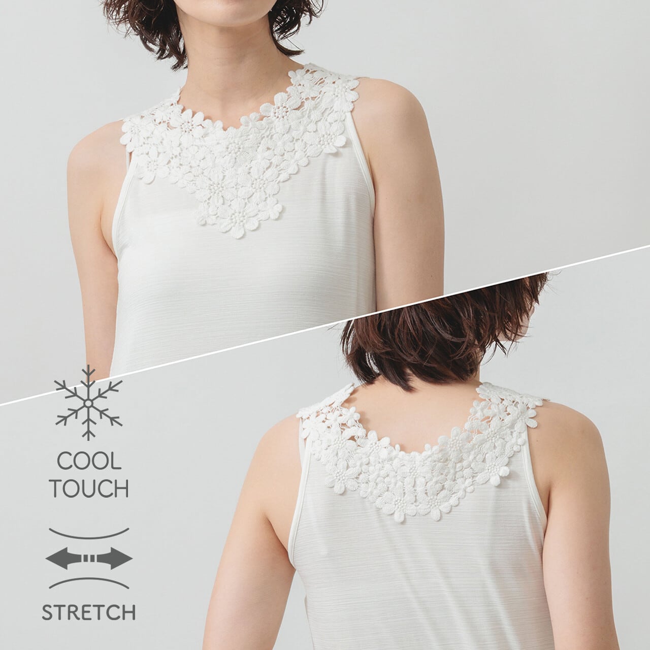 ひんやり心地いい。レースで魅せる大人のタンク。 ひんやりとした肌触りが心地よい、華やかなコットンレースをあしらった冷感素材のタンクトップ。 ほどよく伸びる生地が体にやさしくフィットし、装いに上品なアクセントを添えてくれます。
