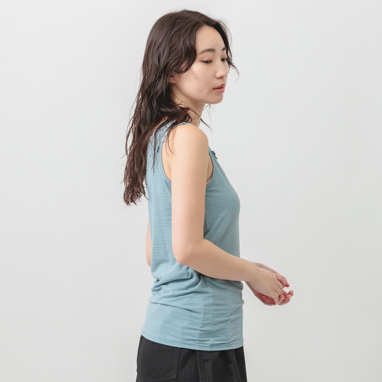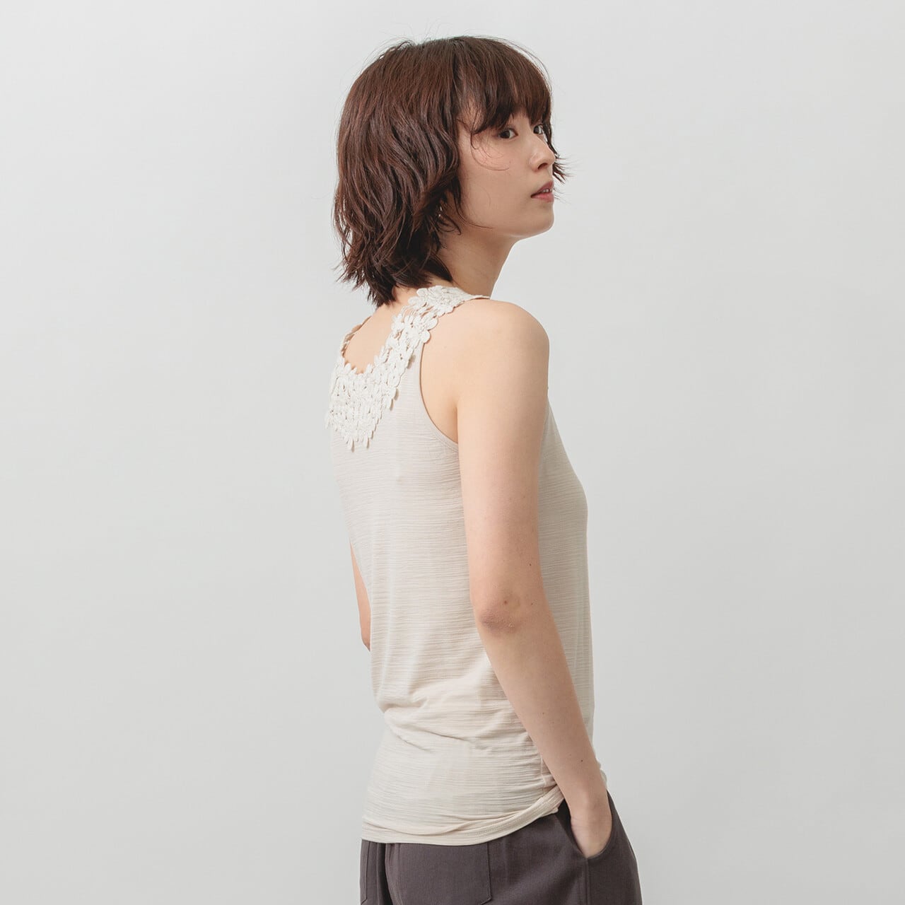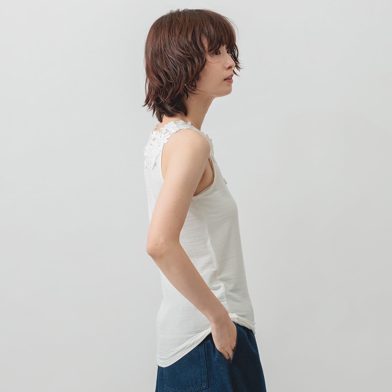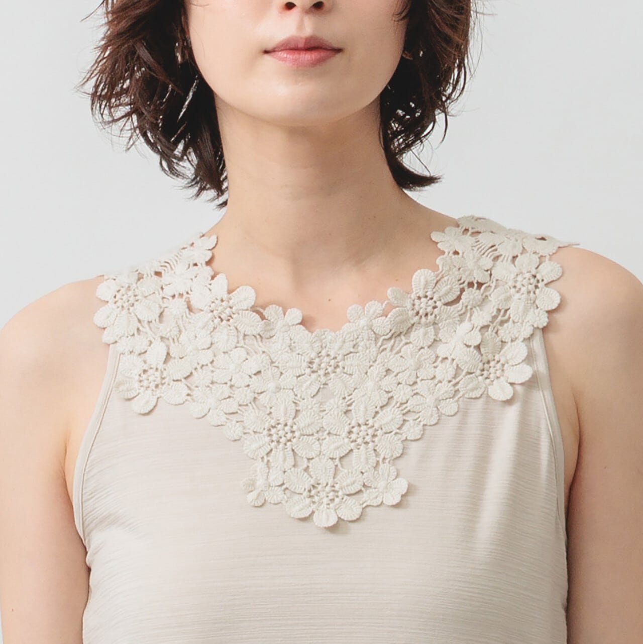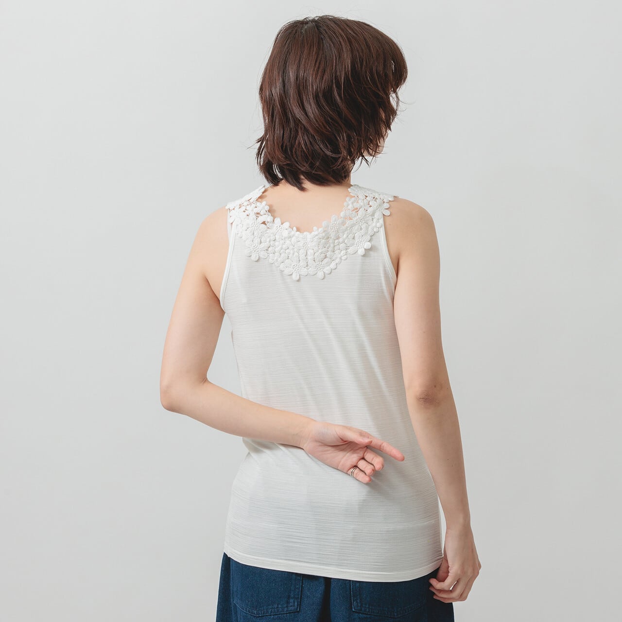 ひんやり心地いい。レースで魅せる大人のタンク。 ひんやりとした肌触りが心地よい、華やかなコットンレースをあしらった冷感素材のタンクトップ。 ほどよく伸びる生地が体にやさしくフィットし、装いに上品なアクセントを添えてくれます。