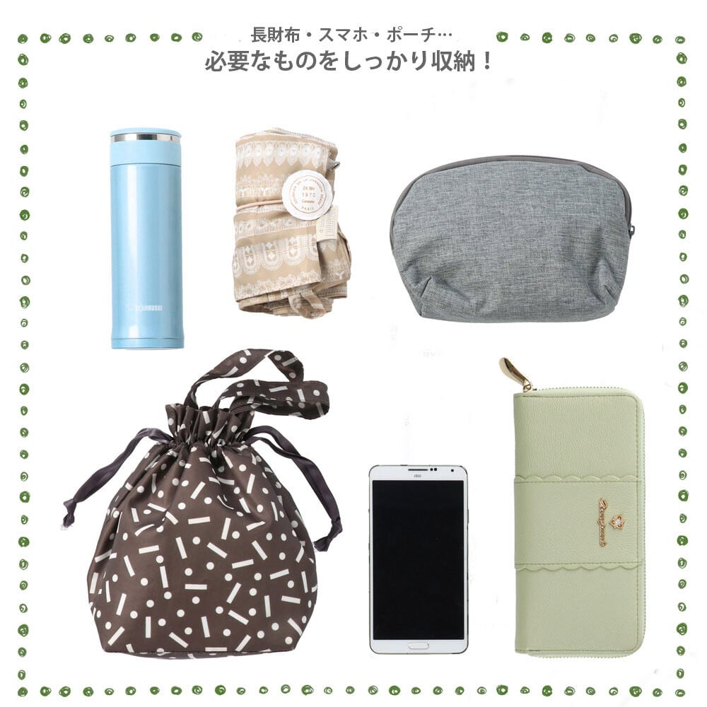 A5ノートが入るサイズなので、ボトルやポーチなどもらくらく入ります外側についたフタ付きのルーポケットもポイントです