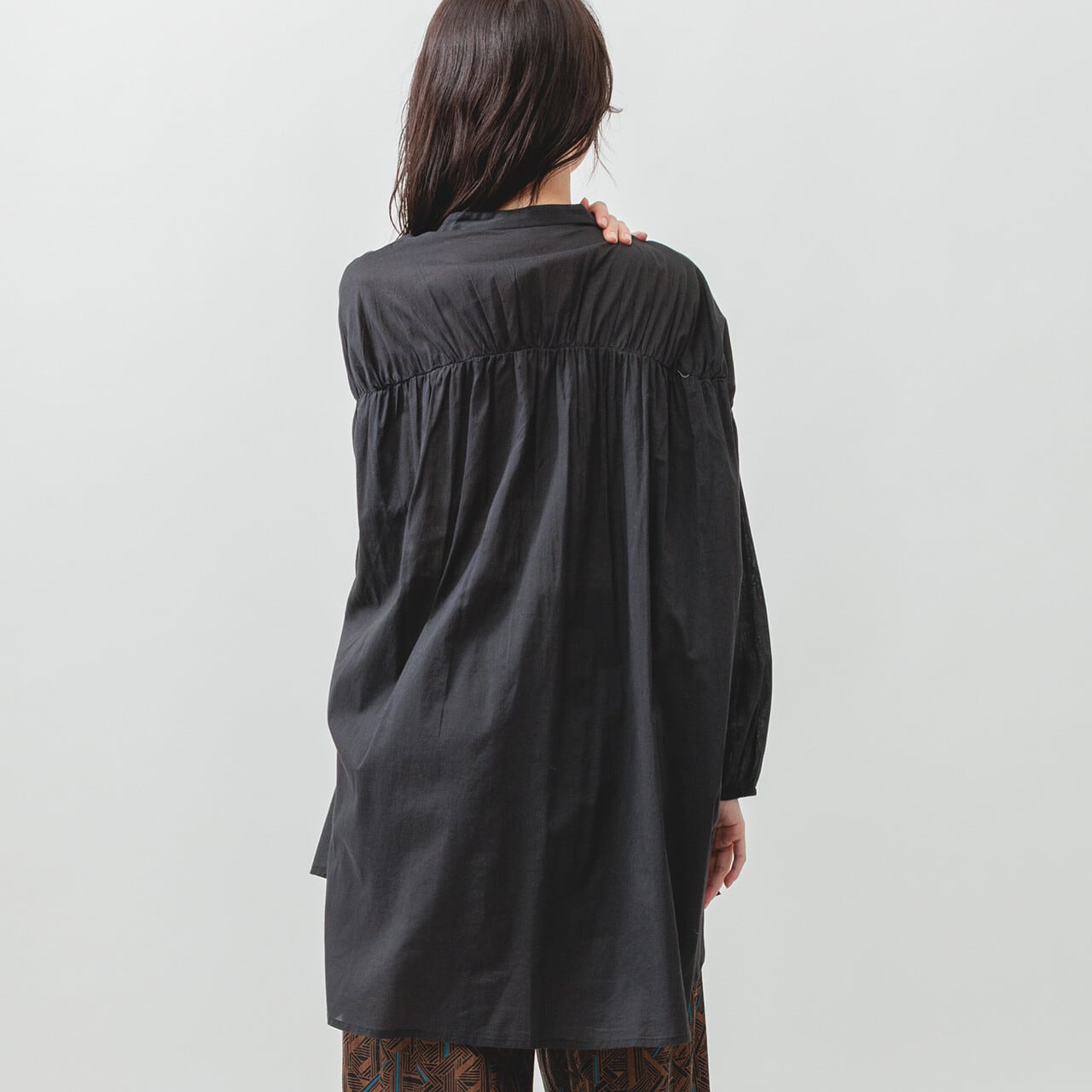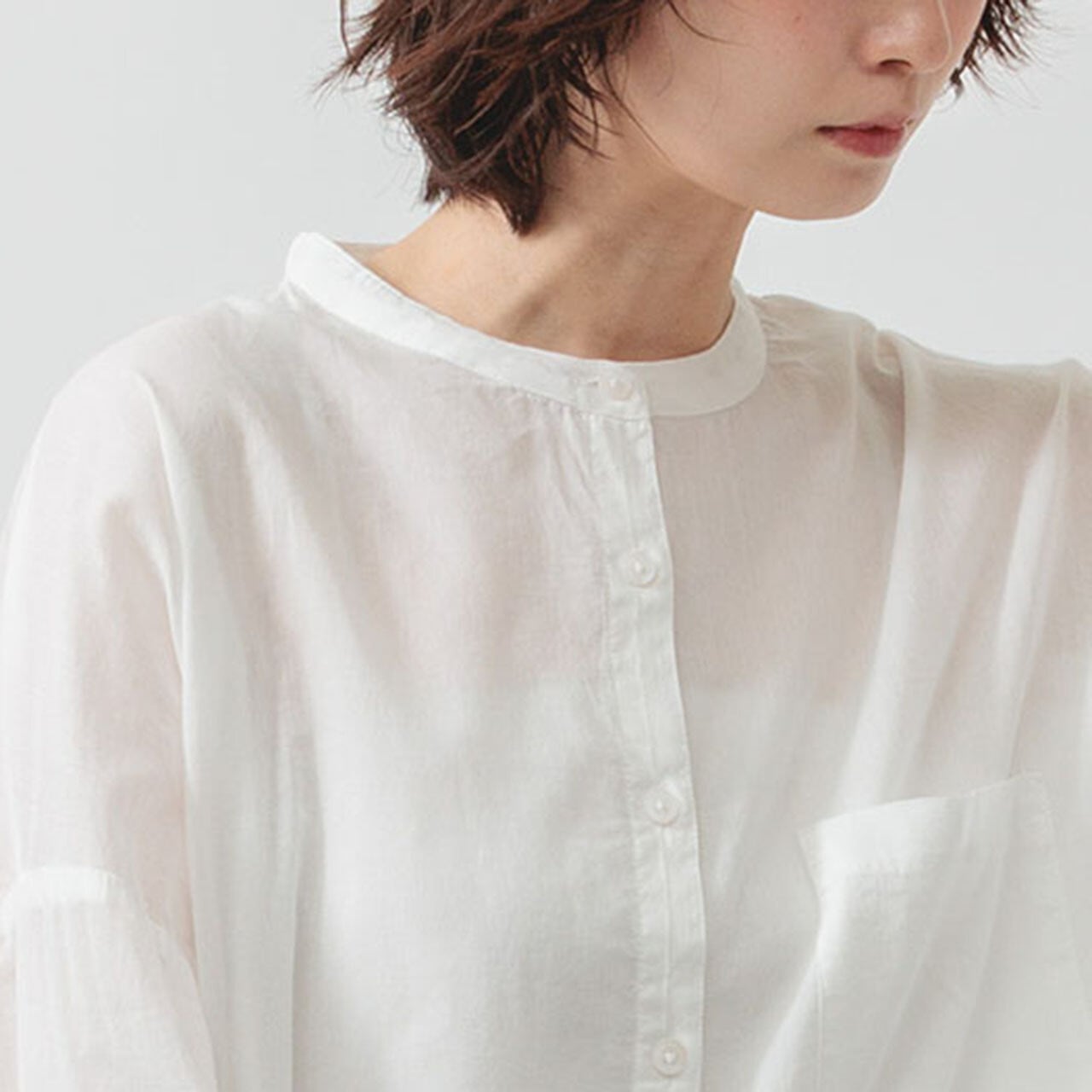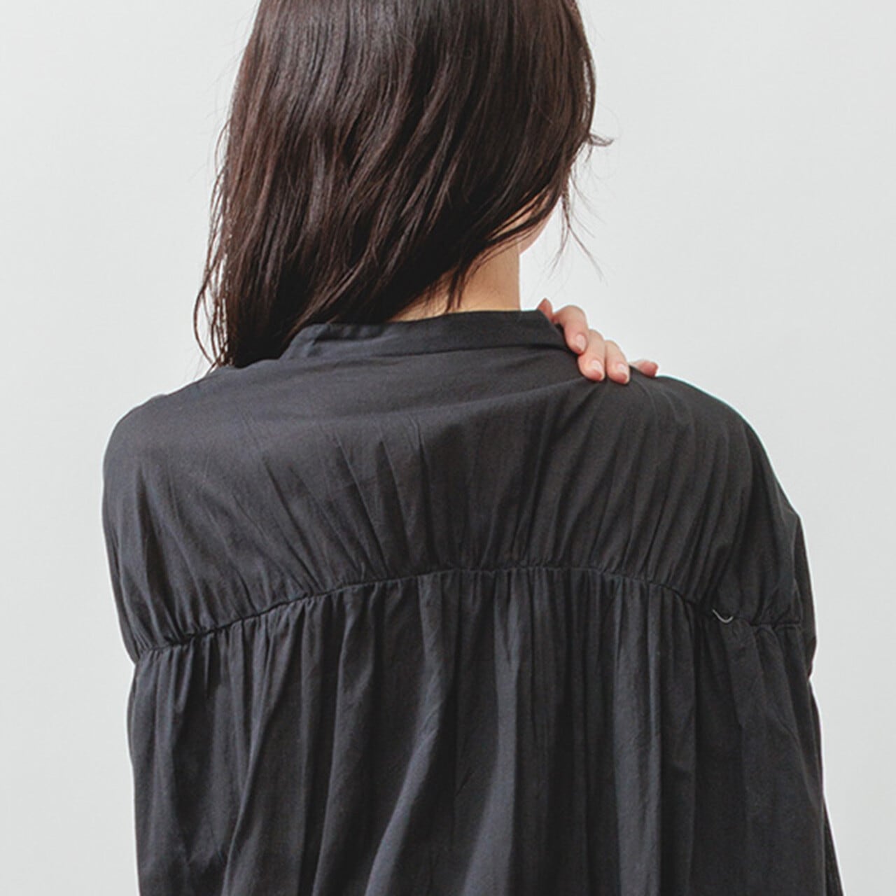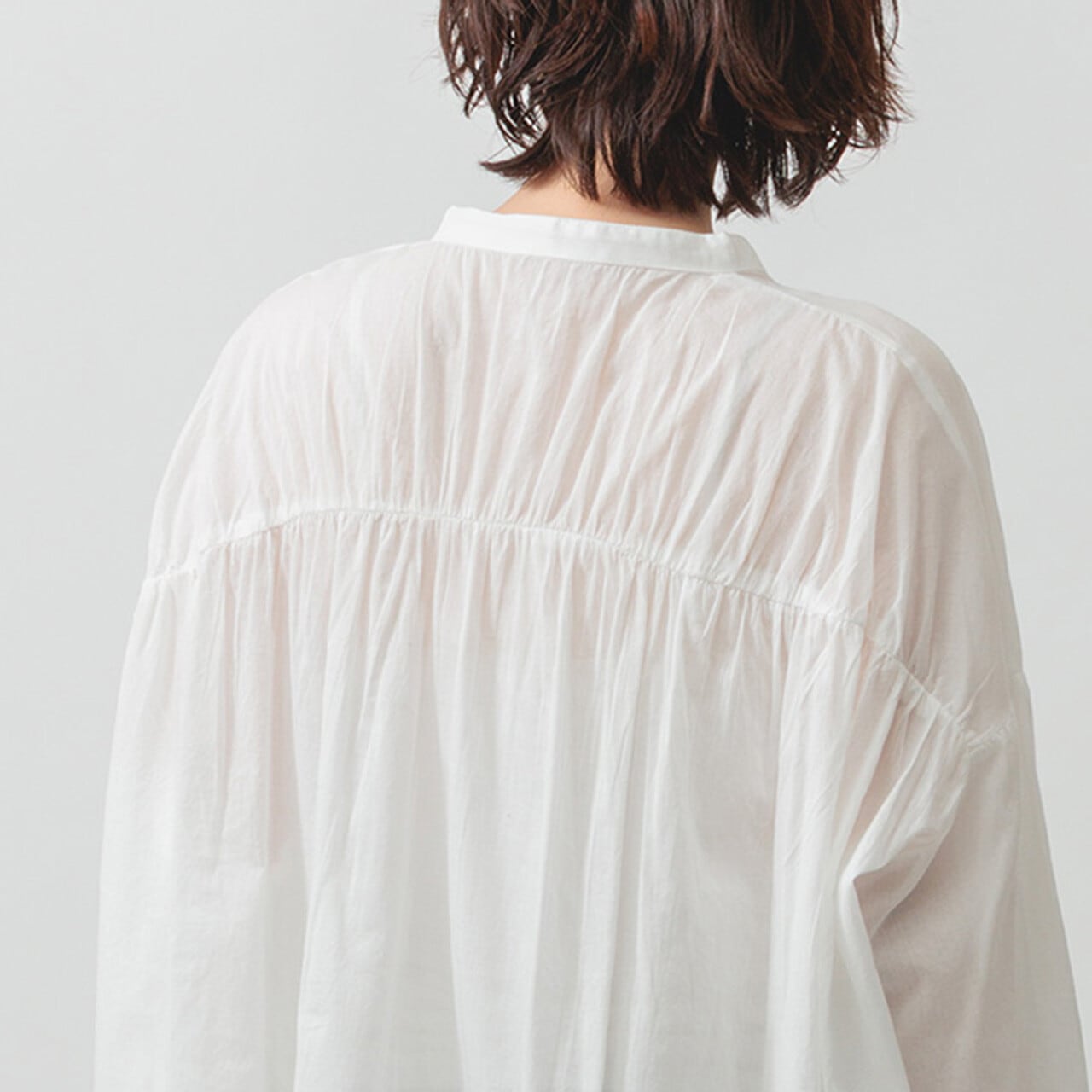 柔らかい風合いの綿ボイルを使用した前開きブラウス。 後ろに多めのギャザーが入っており、ゆったりとしたサイズ感なので着ていて心地良いアイテムです。 シンプルなデザインなので、どんなコーディネートにも合わせやすいです。