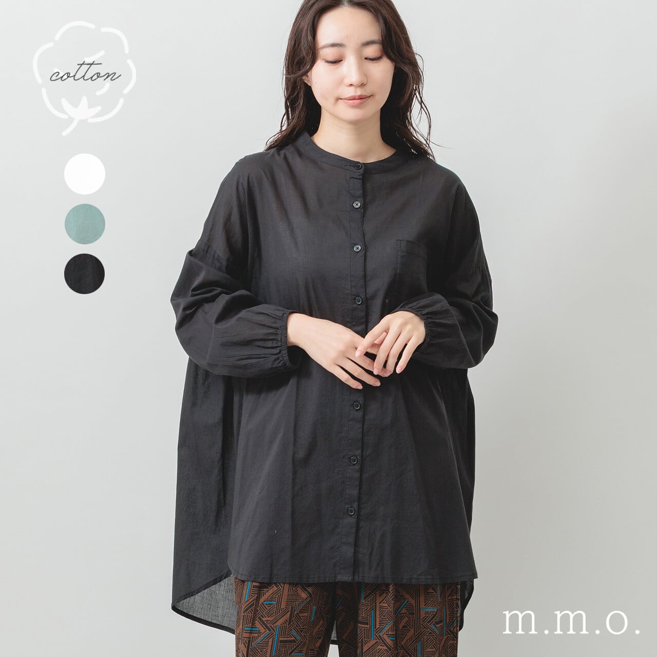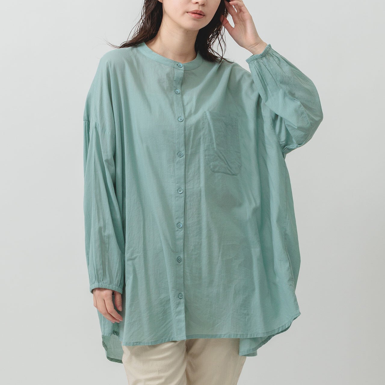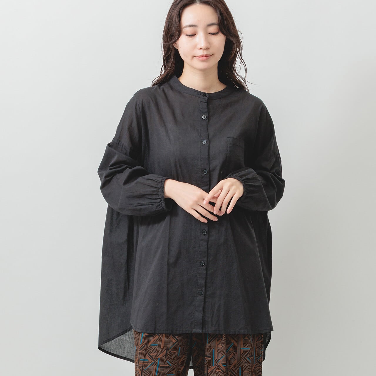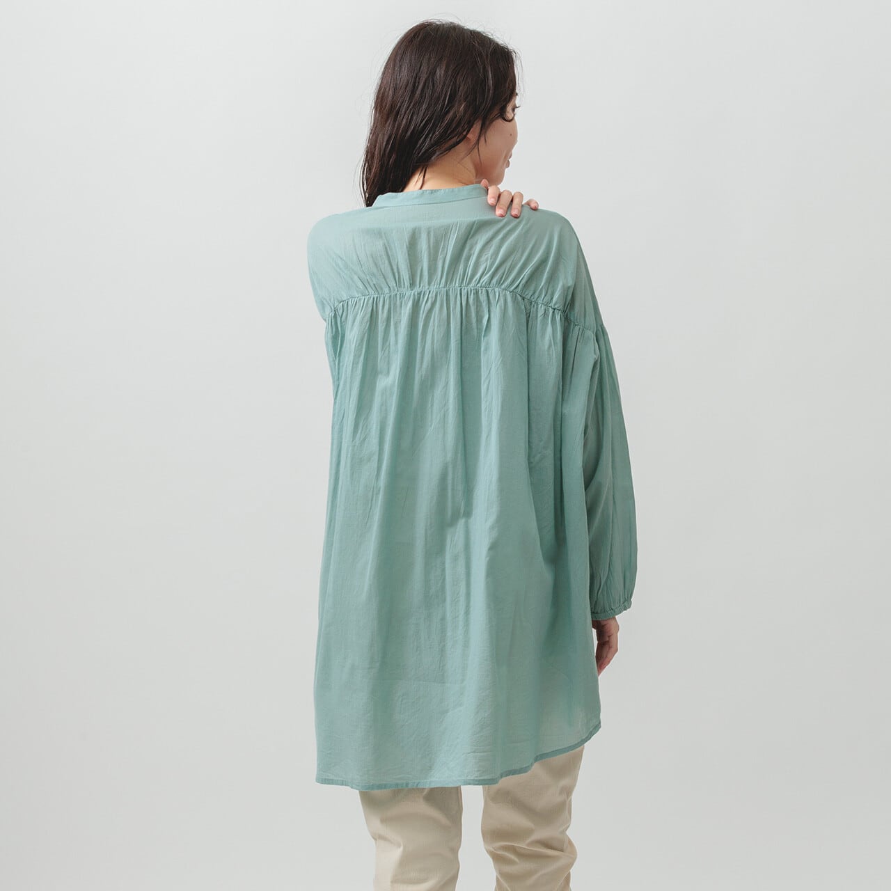 柔らかい風合いの綿ボイルを使用した前開きブラウス。 後ろに多めのギャザーが入っており、ゆったりとしたサイズ感なので着ていて心地良いアイテムです。 シンプルなデザインなので、どんなコーディネートにも合わせやすいです。